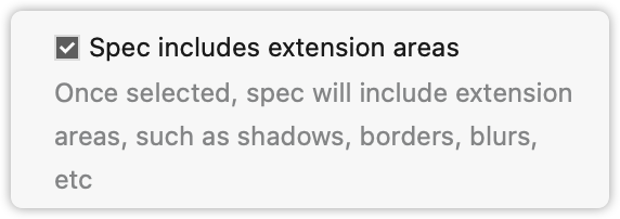 If you select “Spec includes extension area”, your marked assets will include all extension areas such as shadows, borders and blurs. If you don’t select this option your marked assets will be uploaded without the extension area - all assets will be shown in their original layer size.