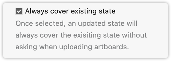 To keep your designs up to date, you can check “Always cover existing state” in Settings if you want to simply upload a new version of an older, already uploaded artboard. Once the new artboard has been uploaded, it will overwrite the older version.